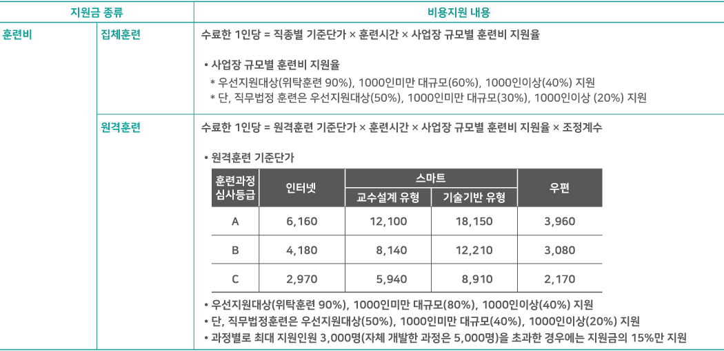 훈련비중 일부 비용지원(과정별 상이) : 직업능력개발훈련실시에 따른 훈련비의 지원은 수료자에 한해 해당 사업주에 대하여 지원 (원격훈련의 미수료자의 경우 진도율 및 평가성적에 따라 일부 지원 가능)